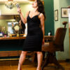 Αμάνικο μονόχρωμο πένσιλ μαύρο φόρεμα με λεπτές ράντες με αυξομειωτές και ντεκολτέ σε σχήμα καρδιάς (heart-shaped).